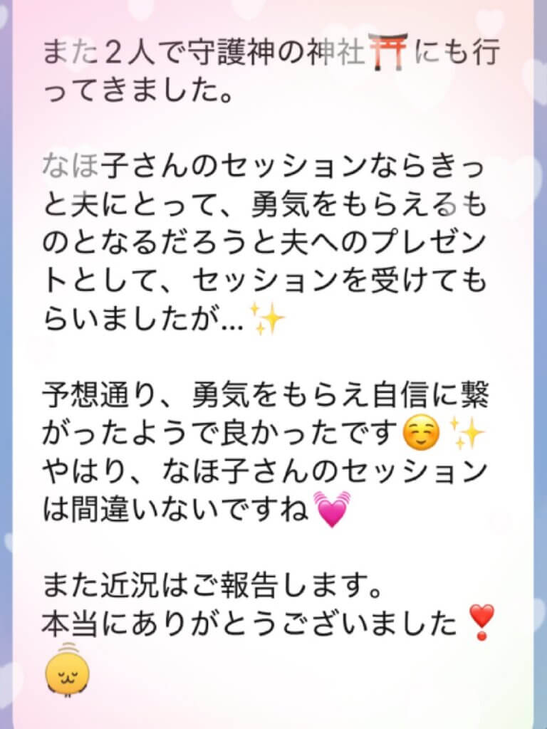 なほ子さんのセッションならきっと夫にとって、勇気をもらえるものとなるだろうと夫へのプレゼントとして、セッションを受けてもらいましたが…✨