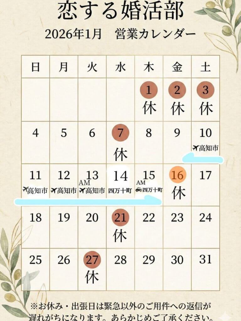 1月10日〜15日の期間、高知へ出張いたします✈️ いつもお馴染みの高知の会員さま、そしてご新規でご予約いただいている方々にお会いできるのを、心から楽しみにしています。 💡【高知出張・婚活カウンセリング】\高知で初めましての方は《初回無料》です/...