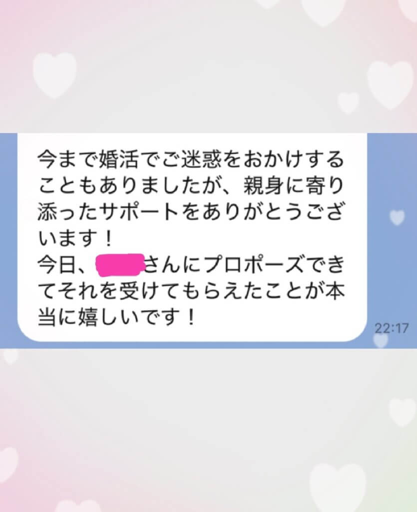 今まで婚活でご迷惑をおかけすることもありましたが、親身に寄り添ったサポートをありがとうございます!